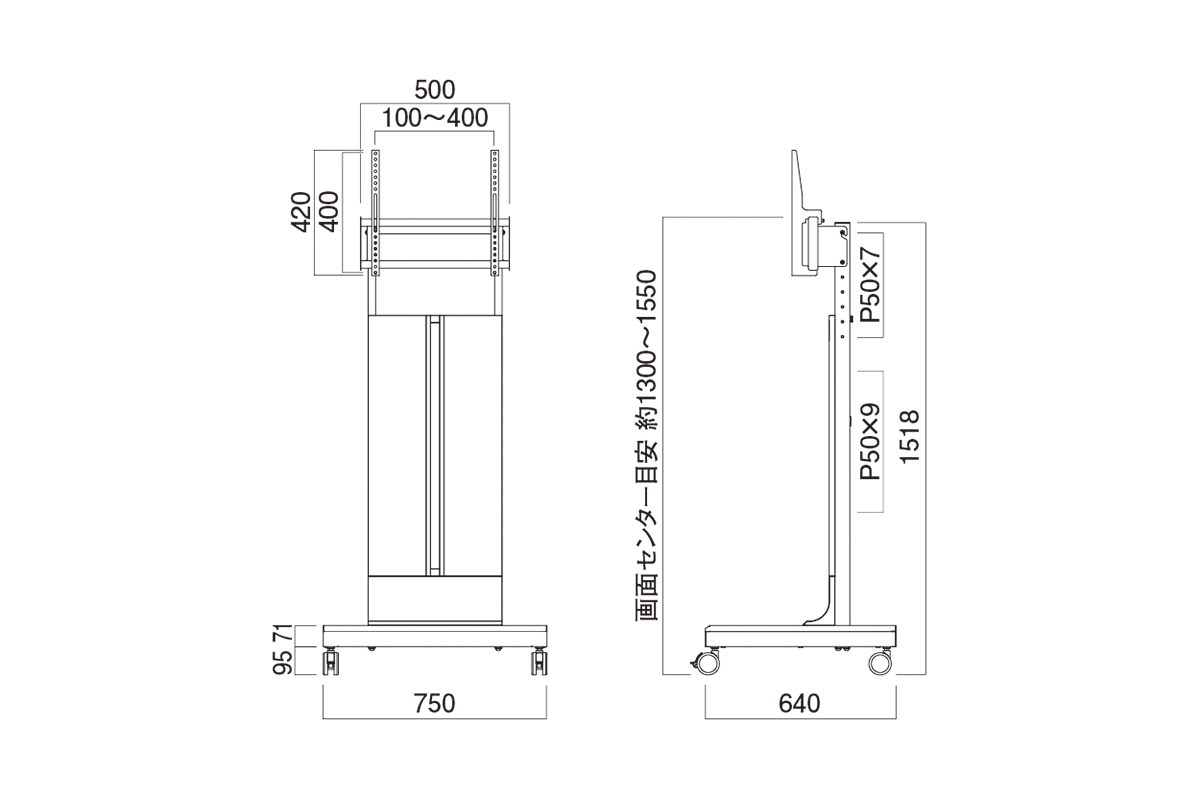 ディスプレイ設置 上下調節:50mmピッチ 6段階