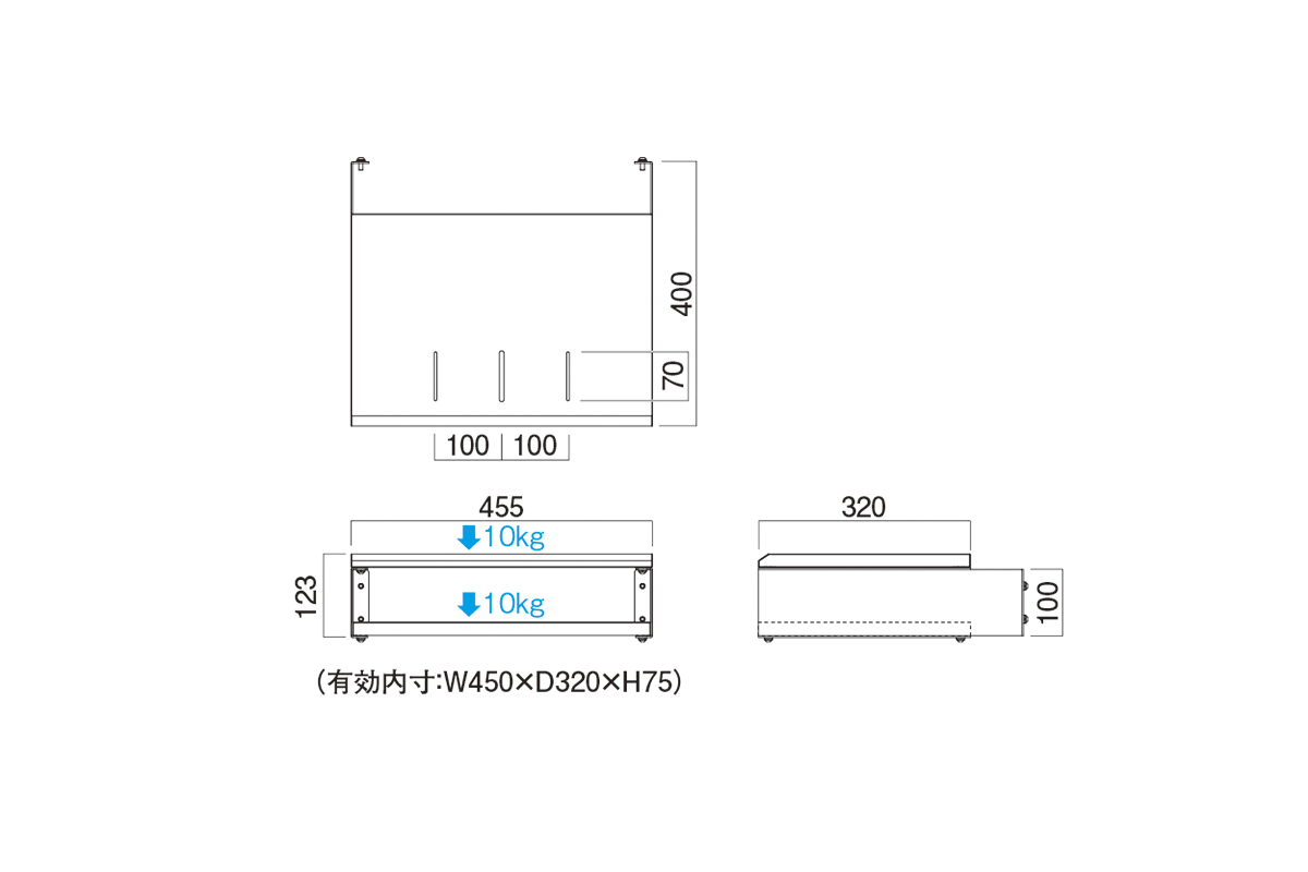 備考 | 有効内寸:幅 450 × 奥行き 320 × 高さ 75 (mm) ※3個まで取付可能。 |