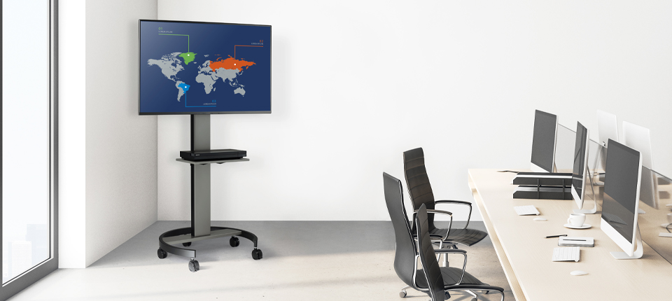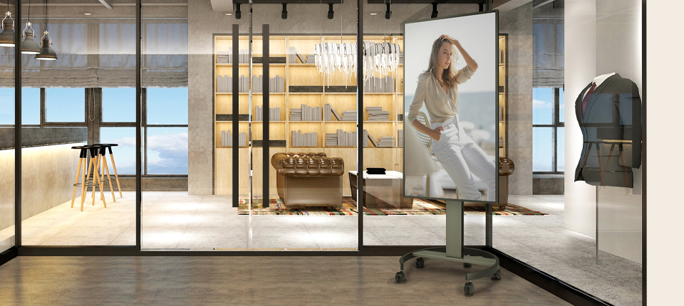 洗練されたカラーリング。コーナー設置に優れたディスプレイスタンド。