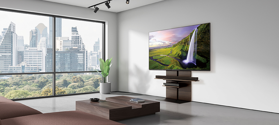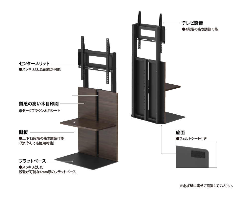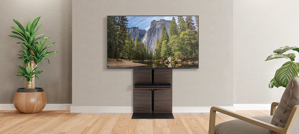 パネルデザインの支柱が高級感を演出。床になじむフラットベースモデル。